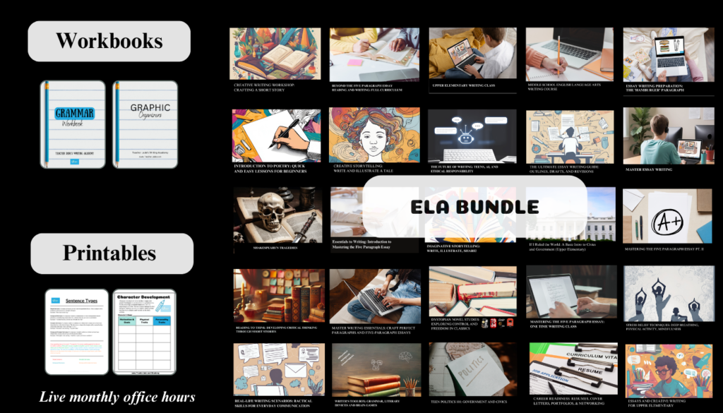 Academy Teacher Jade (Founder) Become an Academy Ambassador and Earn Money Welcome to The Writing Academy + Why Choose the BundleOver 25 English Language Arts courses (with over 100 modules) ranging from grades 4-12th. Families get lifetime access.Feedback from a real instructor.Siblings can be added for less than $100.You have the flexibility to complete courses based on your own schedule.Access to newly added classes at no additional cost. https://teacherjade.com/wp-content/uploads/2025/01/TJWA-Intro-3.mp4 Buy the Bundle And Access All the Classes Listed Below for One Price! Buy the Bundle - Access to ALL the Self-Paced Courses Parent Academy Literature Packs Blog Live Classes Facebook Instagram Pinterest Tiktok Youtube