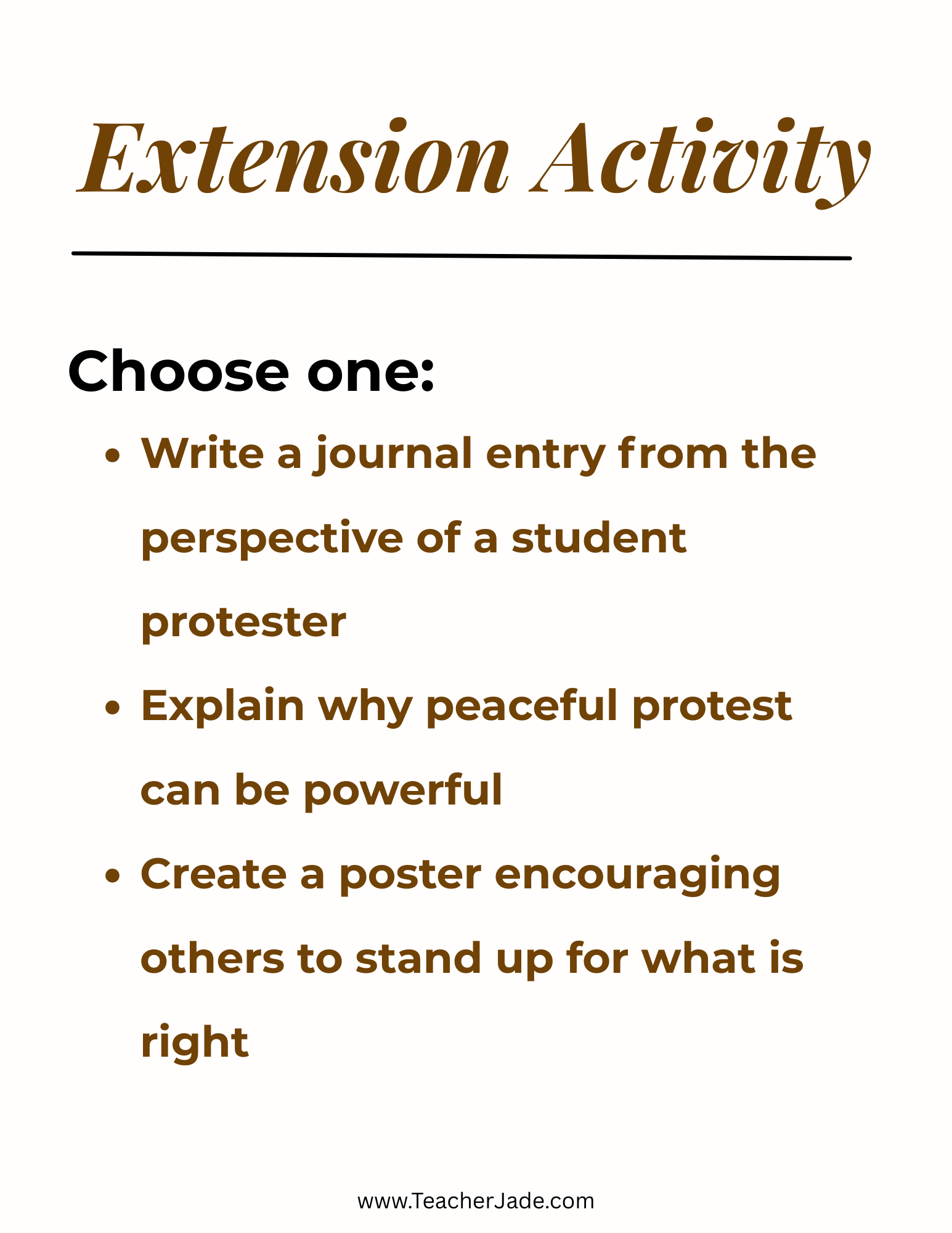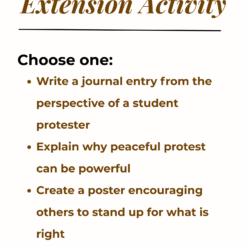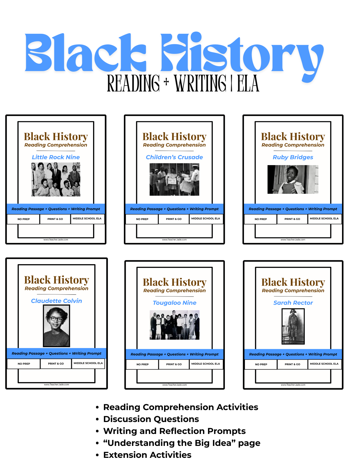 Students will learn about key figures and events through reading passages, comprehension questions, writing prompts, and extension activities designed to build critical thinking and writing skills.