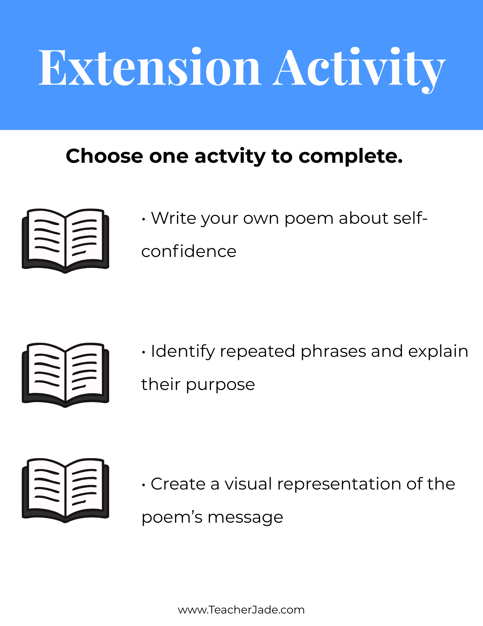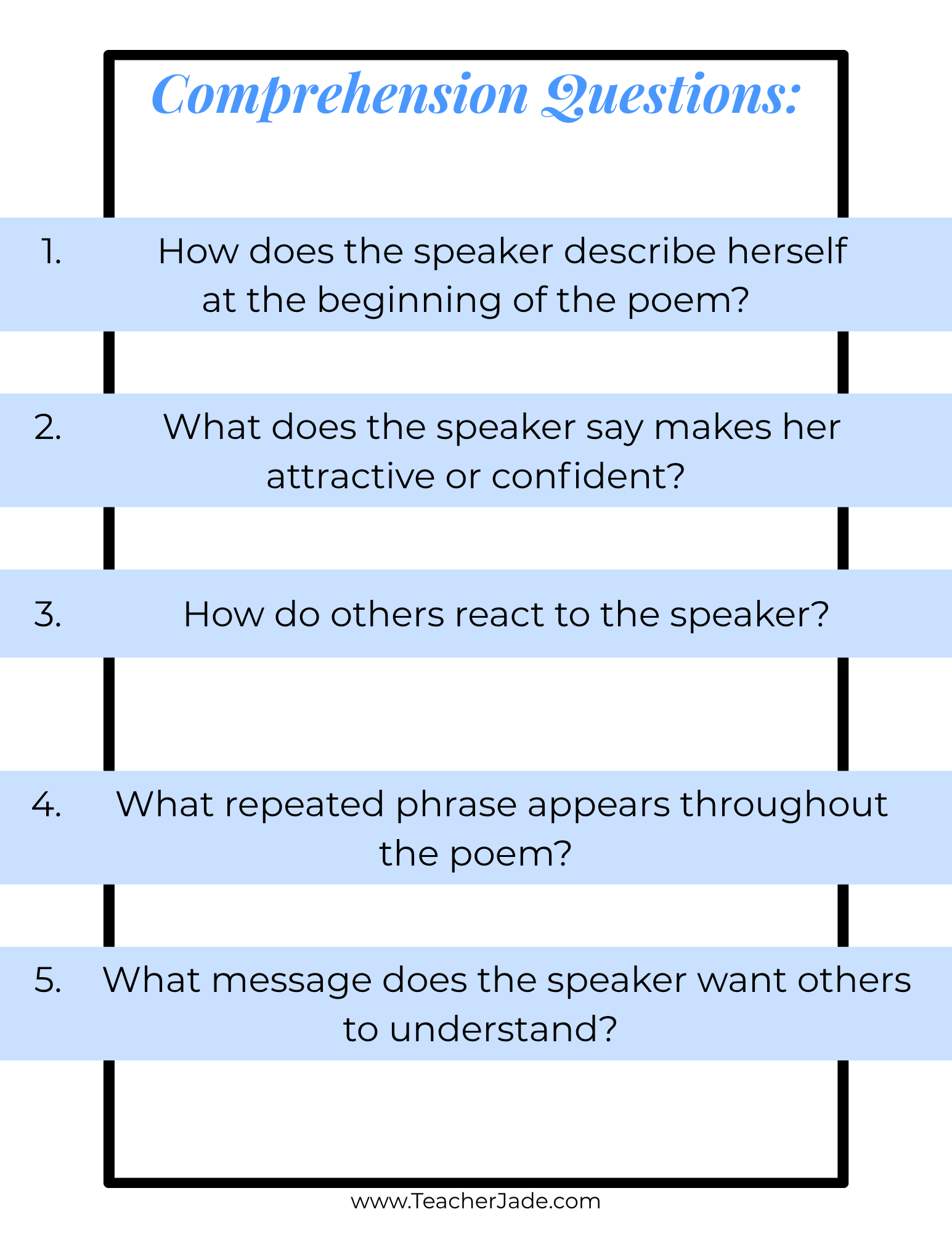 Help students analyze poetry with this activity for Phenomenal Woman by Maya Angelou. This resource explores confidence and identity through comprehension questions, writing prompts, and extension activities.