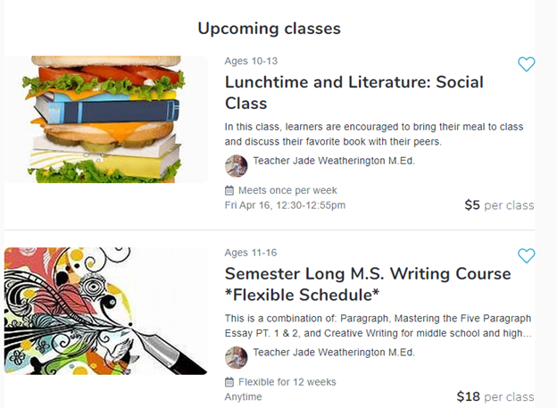 Picture1 Published April 12, 2021 at 624 × 457 in Refunds and Reviews: When to Give a Discount The top class meets for 25 minutes. We eat lunch and talk about books. The second class is prerecorded, but there are weekly assignments that I provide feedback on. Next →